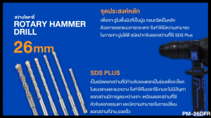 สว่านโรตารี่ PUMA รุ่น PM-26DFR 3 ระบบ พร้อมหัวจับดอกแบบ SDS-PLUS สามารถใช้ร่วมกับดอกสว่านระบบ SDS-PLUS ทั่วไปได้ ใช้งานได้หลายรูปแบบ ไม่ว่าจะเจาะหรือสกัดปูนก็ทำได้หมด เหมาะกับงานเบาจนถึงงานหนักมาก ในชุดมีดอกสว่านแถมให้ 3 ตัว ดอกสกัด 2 ตัว และหัวเหล็กจับดอก 1 หัว ถือว่าเป็นชุดที่คุ้มค่ามาก สินค้าคุณภาพ ใช้งานได้นาน ทนทาน รับประกันคุณภาพจาก PUMA ต้องลอง!!